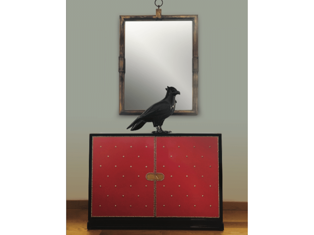 Circa 1950 Tommi Parzinger studded red leather cabinet. Rare form.