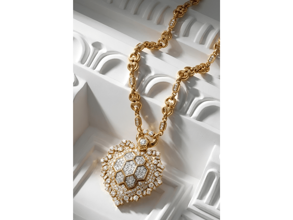 This Cartier necklace showcases the maison’s mastery of graphic elegance and symbolic design. Crafted in warm yellow gold, the articulated chain is punctuated with diamond-set links, leading to a striking honeycomb-inspired pendant pavé-set with brilliant and baguette-cut diamonds—sculptural, radiant, and unmistakably Cartier in spirit, precision, and timeless sophistication.